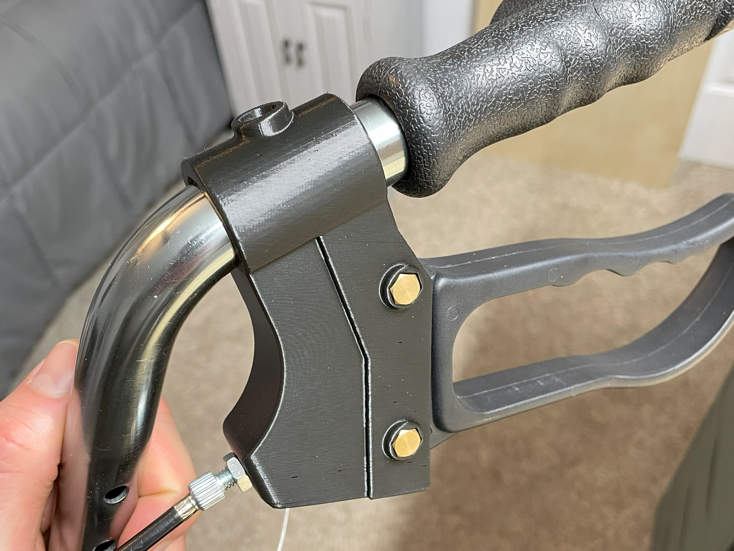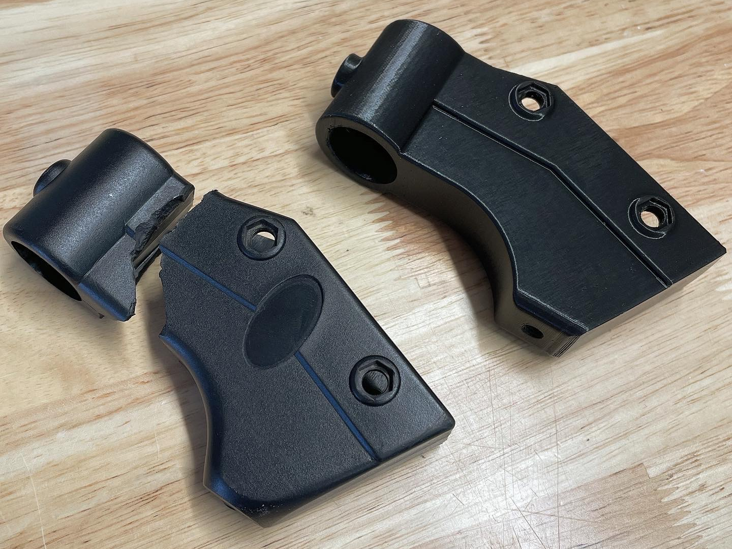 3D printed (PETG) part to replace damaged brake handle bracket on a walker for client. Started with the original bracket and reverse engineered the dimensions using calipers and multiple prototypes to test the fit and function of the assembly.