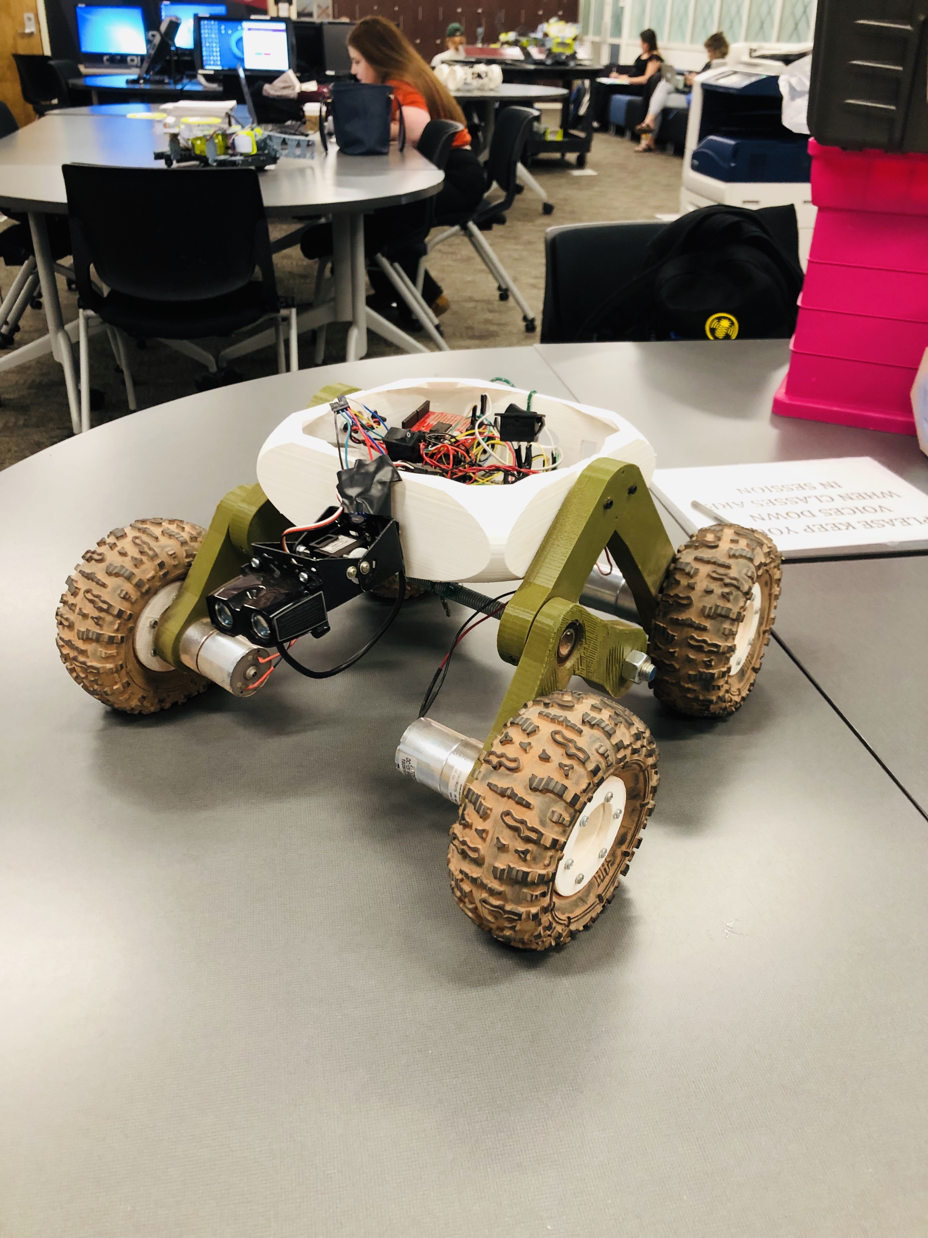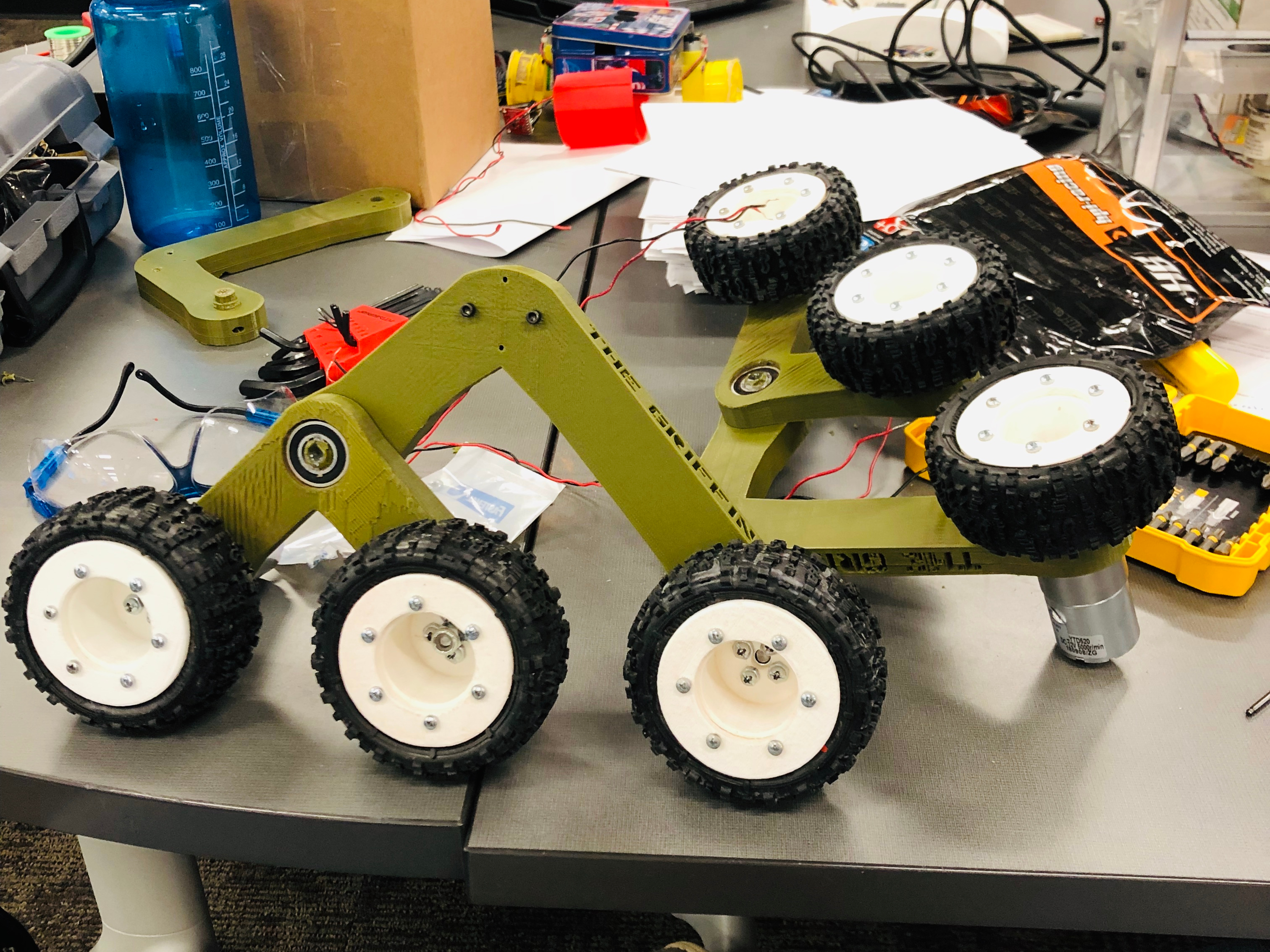 Second iteration of the autonomous rover challenge through the Colorado Space Grant Consortium. Utilized Tinkercad once again for the body, wheel hubs, and an upgraded rocker-bogey style suspension system, similar to the mars rover designs.