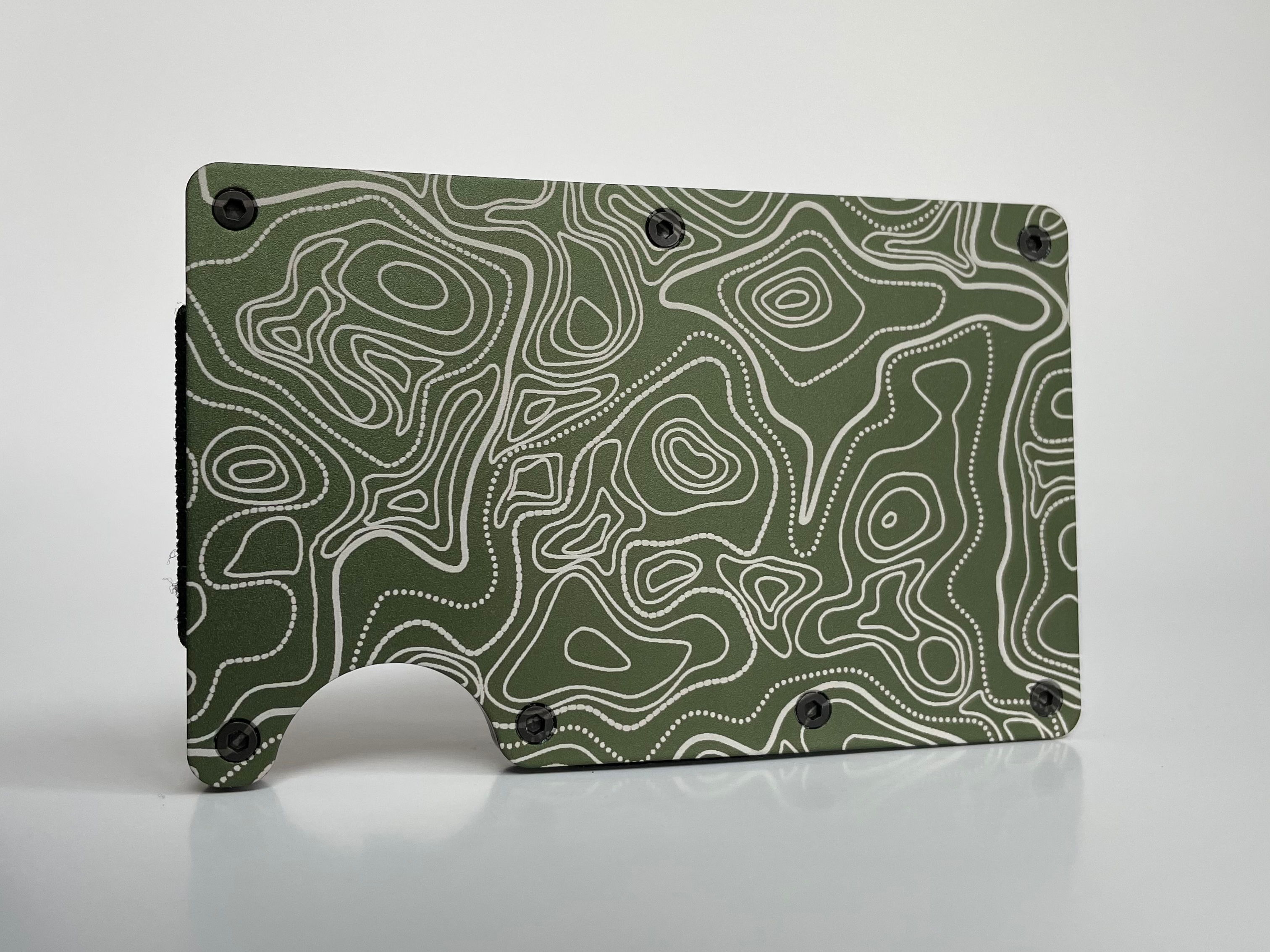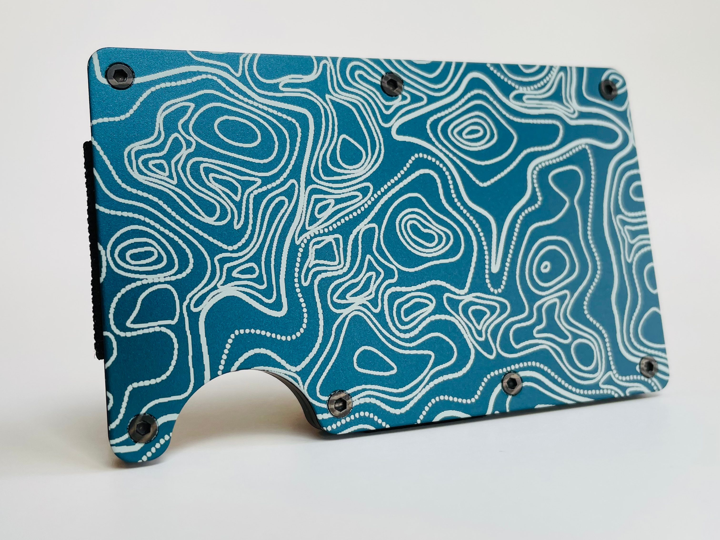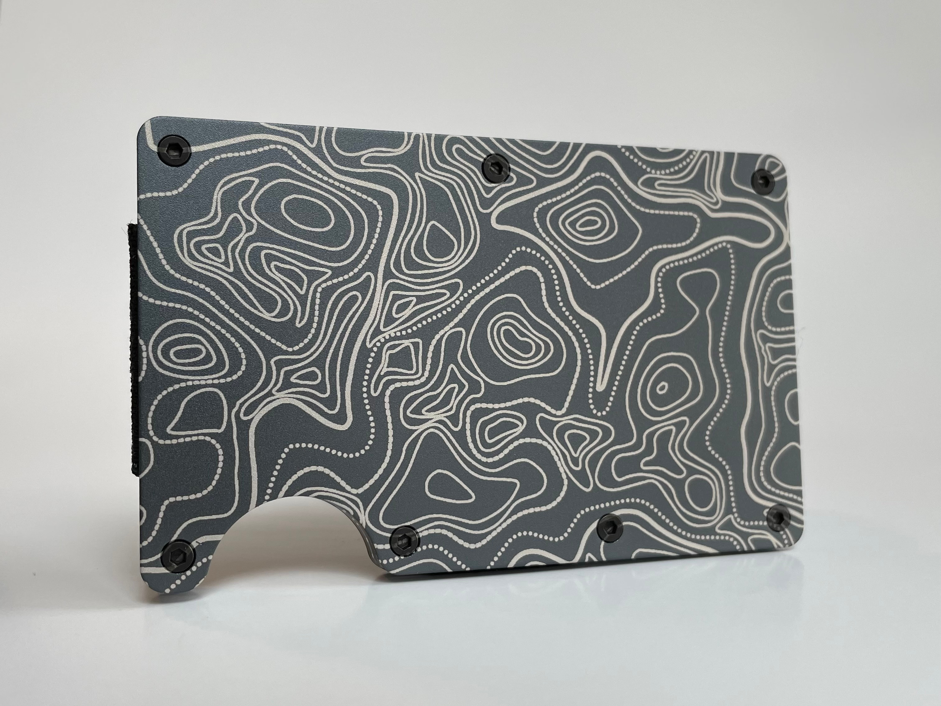 Machined aluminum wallets with an applied laser engraving design I edited using Inkscape to create the .svg (scalable vector graphic) files that were transferred to the wallet bodies using an Xtool D1 20 watt diode laser engraver.